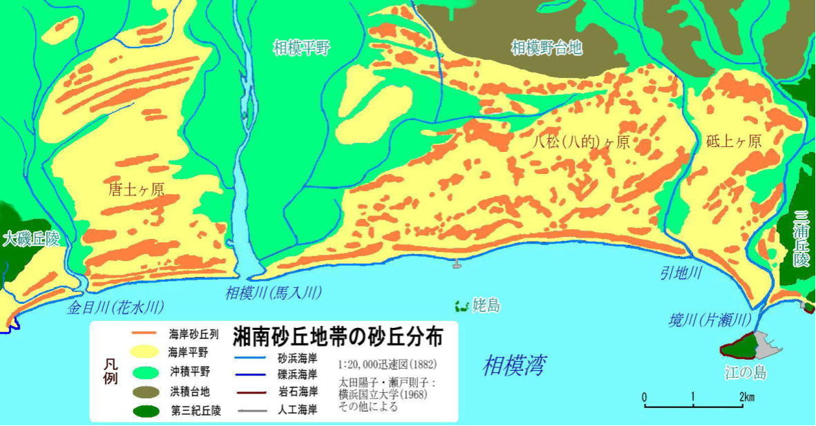 それらによると、湘南砂丘地帯の基盤には、表面の深度が北部で海抜0m、海岸部で海抜-20m程度の南に傾斜する第三紀層があり、その上に北に厚く南に厚い円礫の河成層が載っている。これは、洪積世(こうせきせい)前半の縄文海進以前に形成された扇状地と推定できる。そしてその表面に縄文海進期に沿岸流が運んできた相模川が吐き出す海砂が厚く堆積しているのである。