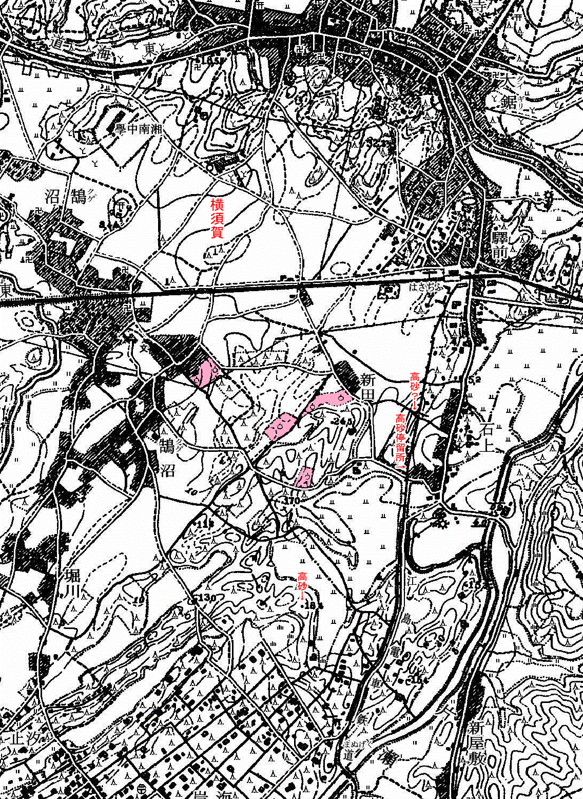 現在の江ノ電石上駅は、1920年から1940年まで「高砂停留所」といい、石上停留所は開業時(1902年)以来別にイトーヨーカドー脇の坂を登った辺りにあった。両停留所とも1940年2月末日で戦時廃止となり、1950年7月15日に高砂停留所が石上駅の名で復活したのである。現在はここから東方に「高砂公園」も開設されているが、付近にこれらの地名の元となった顕著な砂丘は見られない。1921年測図の1:25,000地形図では、現在のカトリック藤沢教会辺りから南方に延びる砂丘列が見られる。あるいはこれかも知れないと睨んでいる。