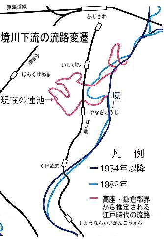 流路変遷洪積台地相模野を浸食し、谷底平野を形成してきた境川は、旧藤沢宿南側に形成されていた砂嘴から発達したと考えられる最北の砂丘列を削って海岸平野・湘南砂丘地帯に流れ出す。谷底平野でも曲流(蛇行)が見られるが、海岸平野に出ると、砂地になるので侵食がたやすく、曲流の幅が大きくなる。上中流では相武すなわち相模国と武蔵国の国境をなしていた境川は、中下流部では高座郡と鎌倉郡の郡界をなす。かつての郡界線は旧流路を示すと思われるから、それを辿ってみると、先ず奥田付近で北へ深く屈曲し、さらに石上付近から西に、曲がりくねっている。郡界線はどの時代に確定したものかは、調べていないが、1700(元禄13)年の『藤沢御殿絵図』にも大きく深く西に屈曲する片瀬川の姿が描かれている。先人はいみじくもこの地を「川袋」と名付けた。「袋地名」は、河川の曲流によって形成される屈曲部に名付けられ、引地川の「地蔵袋」も知られる。全国的には池袋、沼袋が有名だろう。 近代測量学が導入されて最初の地形図である1882(明治15)年測図の二万分一迅速図『藤澤駅』によれば、後に江ノ電が通るあたりまでの屈曲が残っているが、ほぼ現在の流路に近くなっている。1917(大正6)年9月30日の出水でショートカットが行われ、現在の流路が確定した。しかし、大水の度に急流路を突進した水は、江ノ電の土手を突き崩したりしている。 川袋低湿地と蓮池については、千一話の中に別項を立てる予定である。 片瀬川の河口現在鵠沼海岸一丁目と片瀬海岸三丁目との境、すなわち鵠沼地区と片瀬地区との境、かつては高座郡と鎌倉郡との郡境は、肥上げ道が小田急とぶつかるあたりから、湘南海岸公園中央の海風のテラスへと直線的に伸びている。余りにも直線的なので人為境界線のようだが、江戸時代のある時期まではここが片瀬川の河口だったのである。享保の改革の一環として湘南海岸に置かれた鉄炮場の見取り図には、片瀬古川の名でこの川が描かれ、引地川は肥上げ道あたりをずっと東流し、直接海に出ずに、片瀬古川に注いでいる。 感潮河川片瀬川私の最後の勤務先となった神奈川県立深沢高等学校の運動場は、片瀬川の支流・柏尾川のいざという場合の遊水地となるように造られていた。校舎は丘陵の山腹にあったが運動場は八反目(はため)と名付けられた元水田地帯で、最寄りのバス停名に残っていた。この辺の柏尾川は、すっかり三面張りの護岸になっていたが、それでも植物が生え、水鳥の姿も見かけた。川面を覗くと、干満の差をかろうじて読み取ることができた。すなわち、この辺までは感潮河川だったのである。むしろ、本流の境川は、堰跡橋(えんせきばし)あたりで瀬になり、感潮区間は終わる。片瀬川の河口から新屋敷橋(あらやしきばし)上流付近までの間、両岸に隙間なくプレジャーボート類の係留が見られる。これは長期間不法係留として取り締まりの対象とされてきたが、2003年4月から藤沢市は、この不法係留区域を「暫定係留区域」とした。これは取りも直さずこの付近までが感潮河川であるのみならず、両岸の水深がボートの係留や転回に十分であることを示す。 1211(建暦元)年、鴨 長明が飛鳥井雅経と共に鎌倉に下向し、将軍源 実朝と会見する前、砥上が原で固瀬川を渡る際、次の歌を詠んだ。 「浦近き砥上が原に駒とめて固瀬の川の潮干をぞ待(まつ)」 この歌から、鎌倉時代初期の片瀬川には橋はおろか渡し舟もなかったことが判る。 鴨 長明の渡河地点はどの辺だったのだろうか。「浦近き」とあるから海岸のそば、「砥上が原に」とあるから鵠沼地区内と考えたい。鵠沼側の鎌倉時代の遺跡は、江ノ電鵠沼駅近くの「下藤ヶ谷遺跡」が最南端である。引地川側には、「八部遺跡」、「藤原遺跡」がある。ここは大庭御厨の最南端集落である。従って、人跡を辿って歩を進めるならば、これらの遺跡を連ねるルートが「浦近き」ルートということになるだろう。 |