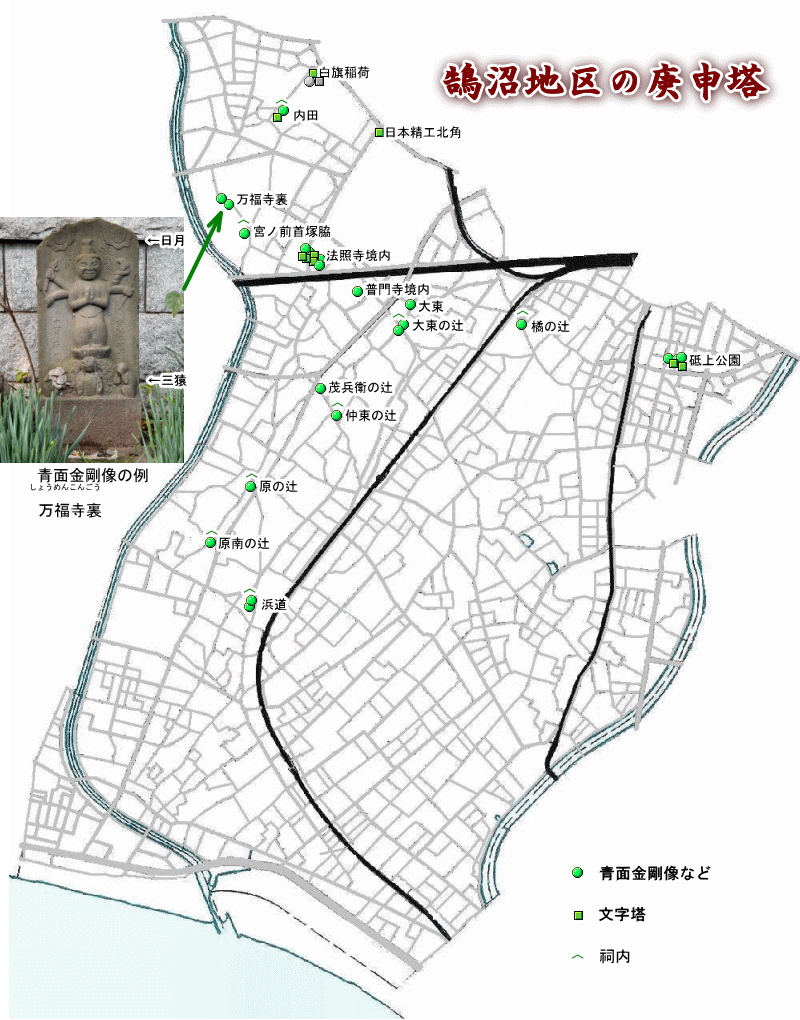 それらのうち、庚申塔は元禄から明治初期に建てられた。今回は庚申塔について述べてみよう。 庚申塔とは庚申塔(こうしんとう)は、中国より伝来した道教に由来する庚申信仰に基づいて建てられた石塔のこと。庚申講を3年18回続けた記念に建立されることが多い。庚申講(庚申待ち)とは、人間の体内にいるという三尸虫(さんしのむし)という虫が、寝ている間に天帝にその人間の悪事を報告しに行くのを防ぐため、庚申の日に夜通し眠らないで天帝や猿田彦や青面金剛を祀って宴会などをする風習である。 現存する鵠沼地区最古の庚申塔は、1689(元禄 2)年建立の車田の白旗稲荷境内にあるものだが、もともとここに建てられたものかは疑問がある。庚申塔は他の石造物よりも作成された年代が読み取れるものが多く、元禄から文化年間の125年間に90%が集中している。庚申講は現在もわずかに継続されているというが、明治以降に建てられた庚申塔は、3例のみである。 庚申塔の形態は、青面金剛(しょうめんこんごう)像の浮彫を施したものと、文字塔の2種類に大別できるが、宝暦年間(1763年まで)に建てられたものは、車田の白旗稲荷境内と日本精工北角の元禄9年の文字塔以外は全て青面金剛像である。明和元年(1764)以降は急に文字塔が増え、青面金剛像は3体しか建てられていない。 青面金剛とは中国の道教思想に由来し、日本の民間信仰のなかで独自に発展した尊像である。庚申講の本尊として知られ、三尸を押さえる神とされる。 三眼の憤怒相で、一般には足元に邪鬼を踏みつけ、六臂(腕が6本)で法輪・弓・矢・剣・錫杖・ショケラ(人間)を持つ姿で描かれることが多い。頭上の両側に日月、足元には三猿が彫られることが一般的である。 屋根付きの小祠に祀られることが多く、扉は付かない。鵠沼地区の場合、法照寺境内や砥上公園に集められた場合を除き、路傍のものは多く小祠に祀られている。法照寺境内は小田急線敷設や日本精工建設の際、砥上公園は藤沢駅前南部地区区画整理の際に集めて移設されたものである。 他の路傍石造物には例がないが、庚申塔は道標を兼ねるものが見受けられる。鵠沼地区の場合、橘の辻の庚申塔には右側面に「右ゑのしまへ」と彫られている。 庚申講庚申信仰は中国の道教の伝説に基づくものである。人間の頭と腹と足には三尸(さんし)の虫(彭侯子・彭常子・命児子)がいて、いつもその人の悪事を監視しているという。三尸の虫は庚申の日の夜の寝ている間に天に登って天帝(「閻魔大王」ともいう)に日頃の行いを報告し、罪状によっては寿命が縮められたり、その人の死後に地獄・餓鬼・畜生の三悪道に堕とされるといわれていた。そこで、三尸の虫が天に登れないようにするため、この夜は村中の人達が集まって神々を祀り、その後、寝ずに酒盛りなどをして夜を明かした。これが庚申待、それを行う集まりが庚申講である。庚申待を3年18回続けた記念に建立されたのが庚申塔である。庚申講は全国に見られるが、ことに相模国で江戸中期に爆発的に流行したといわれる。鵠沼地区の庚申塔を調べると、このことを裏付けることができる。 60日に一度の庚申講は、村人にとって良いレクリエーションの機会を与え、楽しみの一つだった。鵠沼地区内では現在もごくわずかに行われているが、庚申塔を建てることは行われていない。