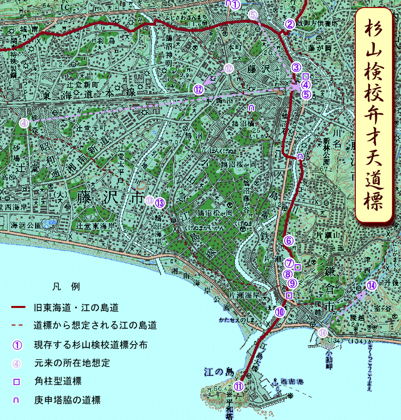 江の島道と弁才天道標江の島の弁天信仰は、1182(寿永元)年に源頼朝が文覚上人に命じて、ここに弁才天を勧請したことに始まり、やがて、弁天信仰と風景の美しさから参詣の人々で賑わうようになった。初めは僧侶の信仰が中心だったが、中世には武家、特に後北条氏の信仰が篤く、江の島を保護する。 岩本院は室町時代には岩本坊と称していた。江戸時代の江の島では、江島神社の別当は金亀山江島寺で、下ノ坊、上ノ坊、岩本坊があった。 元禄期頃には江戸の町人文化が盛んになり、大山、江の島、鎌倉、金沢八景を結ぶ参詣観光ルートが人気を集めたことは、落語の「大山詣り」でも知られる。 その頃、盲人の杉山和一が江の島で修行し、鍼の施術法の一つである管鍼(かんしん)法を創始した。 杉山和一は1689(元禄2)年に関八州の当道盲人を統括する「惣禄検校」となり、全部で48基の江の島弁才天道標を江の島道沿いに建てたといわれ、川柳にも詠まれている。全て高さ120cm程度、幅・奥行き20cm程度と共通の規格を持った安山岩製の尖塔角柱型道標で、正面に弁才天の種子である「ソ」と「恵乃之満遍(草書体)」、右面に「一切衆生」左面に「二世安樂」と彫られている。この種の石造物としては彫りが深い。これは、目の不自由な人のためといわれ、いかにも検校の建てたものらしい。開発による破壊や好事家による盗難に遭い、現在残るものは少ないが、藤沢市の江の島弁才天道標12基は1966年1月17日に市指定重要文化財(建造物)に指定された。 鵠沼の弁才天道標鵠沼地区の江の島道は、現在の石上通りである。藤沢駅南口には、かつて江島神社の一の鳥居が大鋸橋のたもとから移されて建っていたという。ここから現在のファミリー通り、石上通りと続くわけだが、この区間には杉山検校の道標は残っていない。かつては建っていたと思われるが、写真はおろか記録さえ残っていないようだ。鵠沼地区の杉山検校道標は、意外な場所に2基残っている。 1基は鵠沼神明の法照寺入口左側で、教育委員会の解説板も添えられている。これはもともとここにあったものではなく、小田急線敷設か日本精工藤沢工場開設の時にここに移されたと思われる。法照寺境内左側にはこうして移された庚申塔などの路傍石造物がおびただしく集められて並んでいる。これもそういったものの一つであろう。元来は鎌倉街道であった湘南高校前の「中学通り」か、六本松付近からわかれて一本松踏切に向かう「江之島裏街道」にあったものと思われる。これは一時期片瀬の方に運ばれて横倒しになっていたものを宿庭の人が見つけて、荷車で運んできて建て直したのだと伺ったことがある。 上記のように、道標の右面には「一切衆生」と彫られているが、法照寺の道標は「一」の字の上にもう一本横棒が彫られ「二」になってしまっている。これは片瀬にあった時代にいたずらされたものらしい。 一本松踏切の南で南東へ向かう道を辿ると、小田急の踏切を渡った先の三叉路橘の辻がある。第0066話でも触れたように、ここにある庚申塔の右面には「右ゑのしまへ」と彫られている。この右手の道は新田集落を抜けて石上の渡しに向かう旧道だった。地図によっては「江之島裏街道」と添えられている。 残るもう1基は、鵠沼海岸7丁目の民家の庭先に建てられている。そのお宅の方の話では、藤沢市道鵠沼海岸線(鵠沼新道)敷設工事の際(1960(昭和35)年頃か?)、横倒しにされ、工事人が弁当を食う腰掛け代わりにされているのを見て、自宅に運んで建てたものだという。 私は、これが元の場所に建っている頃に調査したことがある。鵠沼中学校3年の頃だ。中学では「社会部」に所属し、郷土史の研究調査を行っていた。 1966年1月17日に藤沢市の江の島弁才天道標12基は市指定重要文化財(建造物)に指定されたが、これだけは指定から外れている。 現在、藤沢市役所新館右手奥に3基の道標が並んでいる。うち2基が杉山検校の道標である。そのどちらかが辻堂市民図書館隣家のY家脇から移されたものだという。(残りの1基は藤沢市民病院付近から移されたらしい) 道路の拡張や線路の敷設、工場の設置や区画整理などにより、路傍の石造物が移設される例をよく目にする。これは致し方ないことかも知れないが、移設はなるべく近くに場所を見つけて欲しい。そして、記録をしっかりと残し、どこから移設したものかを説明する表示が必要である。ことに道標は、その性格上なるべく移設は避けたい。 鵠沼海岸7丁目の民家の庭先の場合、市教委から移設の打診があったが、市役所の例を見て、これよりは現在地の方がましだということでお断りになったと聞く。私はこの意見に同調したい。できれば庭先ではなく、道路に面した塀の外側の方がいいとは思うが。理想的には、元来あった場所に近い鵠沼新道と八部公園に行く道の交差点の地下トンネル入口あたりにあるとなお良い。 | ||||||||||||||||||||||||||||||||||||||||||||||||||||||||||||||||||||||||||||||||||