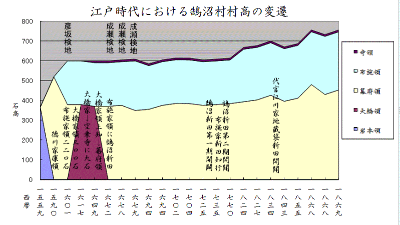 検地と村高の伸長昔から「泣く子と地頭には勝てぬ」という諺がある。地頭すなわち領主は、「殿様」とも呼ばれ、領民にとってはおっかない存在だった。地頭は時折「検地」をし、領地の状況を調査した。それを基準に年貢の割り当てをするのである。 有賀密夫氏は、検地の結果を克明に調査され、村高の伸長具合から次の3期に区分した。