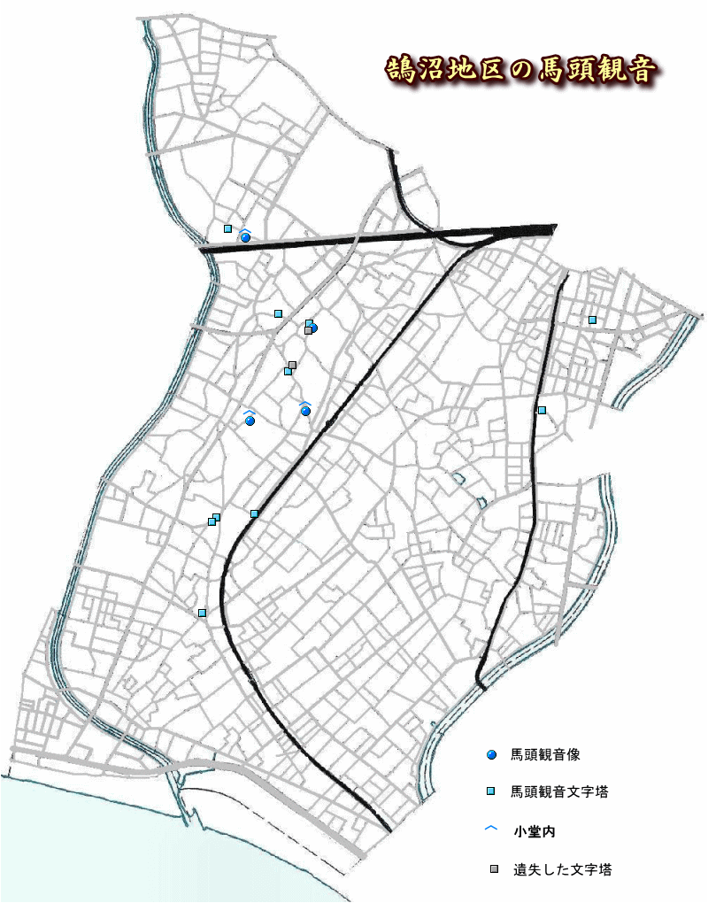 それらのうち、馬頭観音は寛政から昭和初期に建てられた。今回は馬頭観音について述べてみよう。 馬頭観音とはそもそもは仏教の六観音の一つであり、さらに遡るとヒンドゥー教のヴィシュヌ神の化身ともいう。観音像としては珍しく憤怒相で表され、頭上に白馬の頭部を戴く。これが路傍に祀られるようになったのは、家畜の守護神と考えられたからであり、同時に道路の安全を願う意味もあったからだろう。牛馬の供養のために祀られたともいう。 鵠沼の馬頭観音鵠沼の路傍に馬頭観音が祀られるようになったのは、現存最古の中原の辻の1797(寛政 9)年のものであり、江戸時代後半になってから馬頭観音信仰が盛んになったと考えられる。その分布は比較的中央部にかたまっており、原、仲東、堀川に集中している。ことに、一箇所に2〜3基が重なって祀られている場所が3箇所もあるのは面白い。 地蔵尊と共に路傍の石仏だが、馬頭観音像は小堂に祀られる場合が多く、地蔵尊と混同して、赤い頭巾やよだれかけを着けていることがよくある(同様のことが弘法大師像の場合にも見られる)。 本眞寺門前の小田急線踏切脇にあるものは、かつて門前の角にあったものが移されたと思われるが、小田急も線路敷に置いたままにしてあるのは、交通安全のお守りとして邪険に扱えなかったためだろうか。 石上地区の2基は、かつて路傍にあったものを移したと考えられるが、そもそもどこにあったかは不明である。