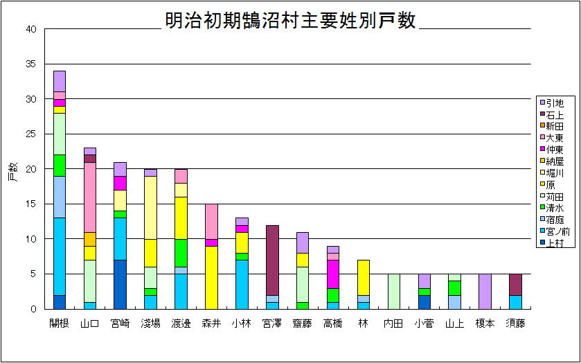 戸別番号明治維新直後、先ず1870(明治 2)年に1番から267番までの戸別番号がつけられた。有賀密夫氏は1980年代に二人の教え子を助手に旧鵠沼村の戸別番号がつけられた家の現状を悉皆調査をされた。その結果、世帯数は285世帯だろうということが判明した。同一家屋に2〜3世帯が暮らしていたり、離れが建っていても同一番号になっているというケースがあるからである。調査結果は、総合市民図書館の『わが住む里』第43〜45号に「明治初期の鵠沼村」と題して報告された。 それをインターネットで見られるような形にまとめて「鵠沼を語る会」のホームページに掲載した。一つは地図の形でまとめ、さらにそこから上部別ウインドウに一覧表の一部を検索できるようにした。もう一つは一覧表の全体像であるが、これは鵠沼を語る会のサイトから直接見ることが困難であるが、このサイト下部の[参考サイト]をクリックすると見られるようにしたので、参照されたい。 さて、戸別番号はどのように付いているかは、既に第0007話で一覧表の形で紹介したように、上村(かむら)の宮崎家を1番とし、1-11が上村、12-57が宮ノ前、58-71が宿庭(しゅくにわ)、72-91が清水となっている。ここまでが皇大神宮の例祭に社前に幟を立てる4町内である。続いて92-118が苅田、119-157が原、158-178が堀川、179-184が納屋(なんや)と、次第に南下し、ここから北に反転して185-201が仲東(なかひがし)、202-220が大東、さらに221-227が新田(しんでん)、228-239が石上と東進し、最後に240-267が最北部の引地(車田を含む)となっている。 この14集落が明治初期に人が住んでいた場所ということになる。 明治初期の鵠沼村居住者有賀密夫氏はこの調査で明治初年段階での戸主名と屋号を調べられた。現在でも本鵠沼や鵠沼神明居住者には同姓の方が多いことに気付く。明治初期はさらに限られたものであった。關根家だけでも34戸と、11%程になることは、第0055話でも紹介した。その主立ったものをグラフ化してみた(下図)。 この他、屋号の分類も試みている。