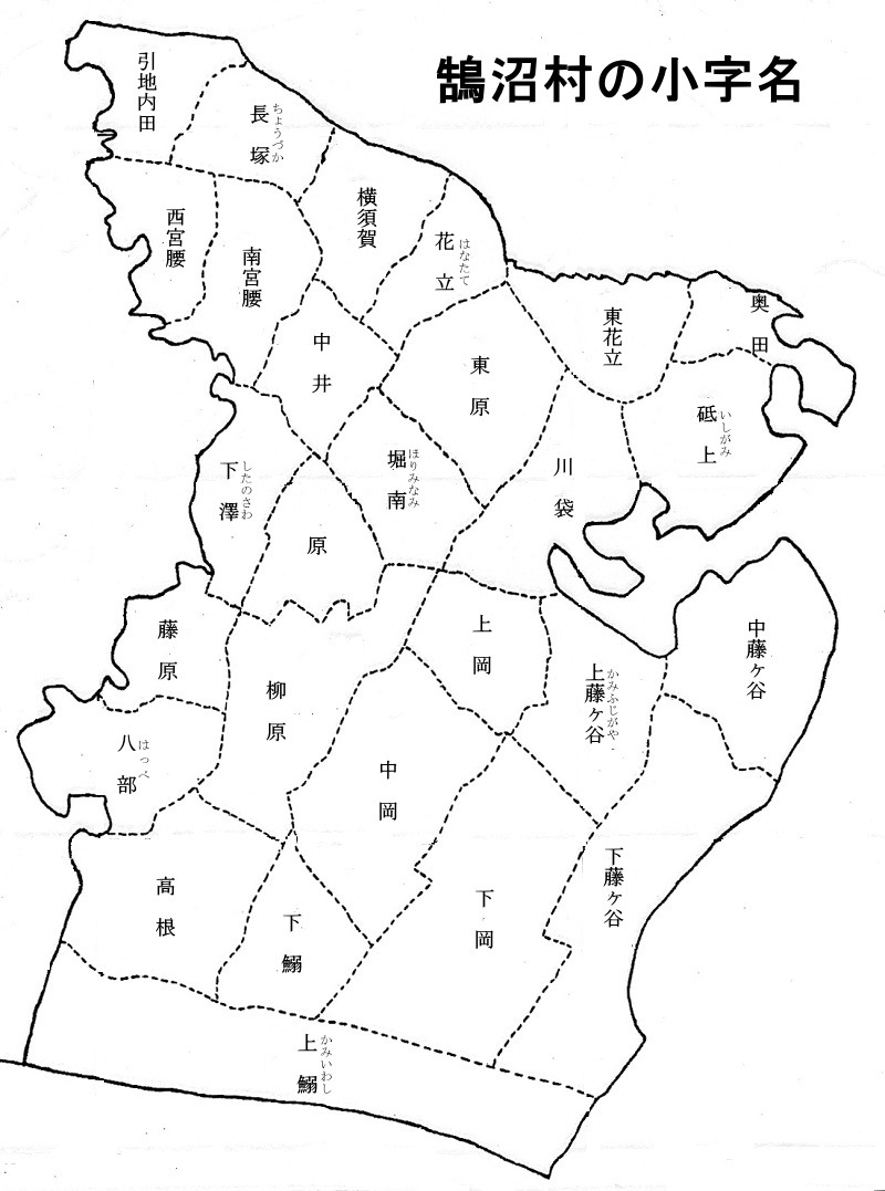 小字の制定1873(明治 6)年5月1日に「区・番組制」が施行され、鵠沼村は第17大区・第2小区となった。これに伴って小字名と番地が振り当てられることになったのだが、これは大変な作業を強いたと思われる。私の見るところ、それまでの伝統的な地区割りやコミュニティーの形成とほとんど関係なく小字が区分されており、集落名と小字名が一致しているのは「原」と「引地」ぐらいである。「石上」は、「砥上」という古い地名を引っ張り出し、それをわざわざ「いしがみ」と読ませている。平安〜鎌倉時代から集落が形成されていた北西部では、一つの集落が二つに分断されていたり、一つの小字の中にいくつもの集落が含まれていたりする。 当時は無人地帯で、まともな道路さえなかった南東部も、適当に区切って小字が与えられているが、そこにはどのような基準があったのだろうか。上中下に分けた小字名が見られるが、その配列も脈絡がない。日本の地名の上中下は都(京都)を基準に都に近い方を上、離れた方を下とする伝統があった(鉄道の「上り」「下り」にその伝統が見られる))し、地形的な上下(河川の上流・下流)の場合もある。前者の例は「上鰯」「下鰯」で、後者の例は「上岡」「中岡」「下岡」や「上藤ヶ谷」「中藤ヶ谷」「下藤ヶ谷」ということになろうか(藤ヶ谷の場合は、高座・鎌倉郡境が制定された時代の片瀬川の流路について理解する必要がある)。それに、これらが隣接するのである。 地域区分もさることながら、小字名の命名基準にも謎が多い。「八部」なんぞという超難読地名をわざわざ引っ張り出してきた理由が知りたい。長塚(ちょうづか)については、故荒木良正老師の次の文章がある。 「長塚―足利時代には、関東に戦乱が長く続いた。戦争の度毎に戦没者は非常に多かったので、当時の住持は里人と協力して近くに塚を築いて、懇ろに葬った。その塚が幾つもあったので「七塚」と呼んだが、いつか訛って「長塚」となり、今では「長塚(ちょうづか)」と呼ばれている。湘南高校一帯の小高いところがそれである。」 番地番地の割り振りは1873(明治 6)年から1878(明治11)年にかけて行われ、これが地図となって公表されたのは1882(明治15)年のことだという。鵠沼・稲荷・羽鳥・大庭の4か村は、東海道の「引地橋」で境を接しており、各村の1番地は引地橋の袂からスタートしている。鵠沼村の場合、そこから南東方向に向かい、最南東部の片瀬村界の7400番地台まで番地が振られた。ところが、その段階では南東部には無人地帯の砂原や山林が多く、後の別荘地開発などで枝番や番地の振り替えなどがおびただしく生じたり、100番台が振られた西宮腰に突如8000番台の番地が後から振られたりと、一筋縄ではいかない。 この小字と番地は1964(昭和39)年から1982(昭和57)年にかけて行われた新住居表示への切り替えによって消え去ったように見えるが、本籍の表示などに未だに生き残っている。小字名は住区基幹公園(街区公園・近隣公園・地区公園)の名に残っている例が多い。 番地と小字名の関係は原則的に下表のように割り当てられたが、上記のような事情で変更がかなり多い。
