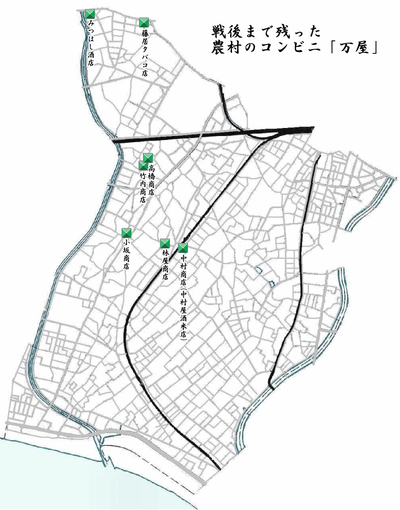 現金収入の増加かつての鵠沼村、ことに本村は自給的な半農半漁村だったから、ほとんどのものは自給自足で、商店が店を開いていなかった。東海道に沿った引地や渡船場のあった石上には、旅人を相手にする茶店や土産物店などが店を並べていたと思われる。 有賀密夫氏の調査した屋号には、「仕立屋」「玉子屋」「時計屋」「烙炉屋」「たねや」「豆腐屋」「らうや」「油屋」「桶屋」「酒屋」「醤油屋」「豆屋」「臼屋」などが見られることから、店舗は構えていなくても、農業以外の収入を得ていた存在が窺い知れる。 明治も中期にさしかかる頃から、農家の現金収入が増加したと見られる。理由の一つは農業の商業化である。モモやサツマイモといった商品作物のブランド化、生糸貿易の伸展に伴う養蚕業の導入などである。 もう一つは鉄道建設を初めとする賃仕事の増加が挙げられる。用地買収に伴う現金収入もあったであろう。 こうした農家の現金収入増加に伴い、農村集落の中に店舗を開くケースが現れる。 農村のコンビニ「万屋」それは、酒や煙草、荒物雑貨、薪炭類、文房具、郵便切手やはがきなど多種類の商品を扱うほか、季節によっては盆花や提灯、輪飾りなども扱っていた。現代のコンビニエンスストアーのようなもので、「万屋(よろづや)」と呼ばれていた。明治末期に塩や煙草の専売制が始まると、その役割は重要なものになった。 戦前の万屋については明確な記録を見つけていない。下は戦後まで残った万屋的性格を持っていた店舗だが、あるいはもっと各集落毎位にあったかも知れない。屋号を見る限り、鵠沼本村に見られた姓は少ない。ということは、転入者が開業したと考えられる。 ここで紹介したのは、独立した店舗として商店街などを形成していなかったものを中心にしている。大正期に入る頃から鵠沼でも各所に商店街が形成され、そこでも酒店などを中心に類似の商業形態が見られるようになったが、ここではあえて農村部に散在するものを取り上げてみた。 ![]() | |||||||||||||||||||||||||||||||||