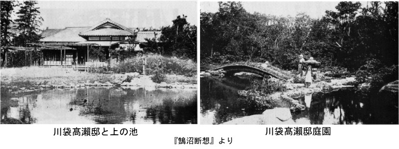 中藤ヶ谷から川袋へ1916(大正 5)年12月20日、父=髙瀨三郎の死によって家督と家業を継ぐことになった長男=髙瀨彌一は、1919(大正 8)年10月22日、川袋2370-1の畑を武藤正五郎より購入した。その一部約5000坪を自宅の敷地とし、邸宅を建設した。場所は橫濱電氣㈱江之島電氣鉄道部が新駅《高砂》を開設することになる西側、川袋の低湿地に向かう南向き斜面の3000坪を邸宅地とし、その下の川袋低湿地に2000坪の池を掘った。 髙瀬笑子:『鵠沼断想』から引用しよう。 「いい松がそびえている丘があり、南はぐっと低くなっていて、藤ヶ谷とのあいだは、川袋の沼沢地と田圃であった。海から吹いてくる風が松林を通り、稲や芦の上を吹いて塩分をおとし、さらさらとした涼風となって来る。このくらい海から離れていることが望ましい、と父が言うのを幾度もきいた。江ノ電の線路から324m位西寄りの一区画に家を建て、そこに藤ヶ谷の家とは大違いの粋な数寄屋造りの家を建てた。関東大震災の直前のことである。美しい三河瓦の屋根、軒が長く、廻り廊下のところどころの柱は細く、数もごく少なかった。こういう華奢な作りであったから、大震災では一たまりもなくぺっしゃんこになってしまった。」 ![]() | ||||||