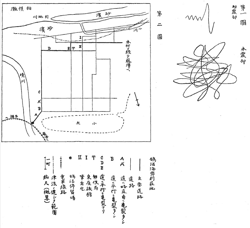 《「関東大震災》の場合、『震災豫防調査會報告』というものが出されていて、1925(大正14)年1月10日に報告された第百號(甲)に、震災当時鵠沼海岸に住んでいた理学士、阿部正夫による「關東大震災特に鵠沼海岸別荘地ニ於ケル状況(A personal experience of the great earthquake in the village of Kugenuma near Kamakura)」という寄稿文が掲載されている。 この文の紹介は、委員の一人寺田寅彦が書いている。寺田寅彦については、第0154話でちらっと触れた。彼は鵠沼(湘南学園の南方)に住んだことがあるという話を聞くが、否定される方もあり、未調査である。 文中に「松本松濤園内ノ一洋館デ間口奥行凡二間ノ二階屋ハ水平ノ長サヨリモ高サガ遙ニ大ク、形トシテハ安定デナイニ拘ラズ傾イタノミデ、倒レモ叉甚ダシ崩レモシナカッタコトハ注意ニ値スル。」とあるのは「松本陽松園」の間違いで、当時岸田劉生がアトリエとしていた建物のことであろう。 阿部正夫氏は、鵠沼海岸別荘地の仲通り有田商店裏手、現在の小田急踏切(当時は開通前)あたりに住んでいたらしい。詳細は未調査だが、ネット検索によれば相対性理論の紹介論文を書いているから、物理学者であったと思われる。科学者の目でとらえた鵠沼の震災の記録として、貴重なものといえよう。 以下にその鵠沼海岸別荘地の震災の様子を述べた主要部分を再録した。 本文の全文をご覧になりたい方は、下の[参考サイト]をクリックすると見られる。 關東大震災特に鵠沼海岸別荘地ニ於ケル状況○概 略 (前文略)大正十二年九月一日未明カラ風(西南)雨オコリ、午前七八時頃最モ暴シク、九時過ギカラ風雨止ミ、シバラクシテ快晴靜穩トナル。十一時五十分頃(五十分卜十二時トノ間也。正確ナ時間ハワカラズ)自分ハ室内二居タガ、急ニ戸、障子、柱等ガガタガタト揺レ、間モナクドーント強イ音響ト共ニハゲシイ強イ上下動ガ一囘アッタ。此時ホド水平動ヲ雜へナイ純粹ナ上下動ハ今迄自分ノ出會ハナイ處デアル。強イ上下動ハスグ二止ンダケレドモ、用心ノ爲ニ自分ハ縁側カラ庭ニ下リタ。庭ニ下リタ時ニハ地震ハ全ク止ンデ居リ、庭ニ立ッテ家ヲカヘリ見ルニ何ノ破損モナイ。「出ルニハ及バナカッタ」ト思フ間モナク遽ニ足元ガユラギ出シ、直ニ自身ハ地上ニタホサレタ。側ノ松ノ小木ニツカマッテ立チ上ルト叉直ニハネトバサレル。上下トナク、前後トナク、左右トナク、メチャクチャニ土地ガ震レテ立チ上ル事ハ出來ナイ。丁度暴風時ニ甲板ニ在ル様デアル。家ノ近クニ居テハ危險ト思ッタノデ地上ヲハッテ門ノ方へト向ッタ。 高サ一間バカリノ竹垣ガ非常ニユレテ居タ。 ザーットイフ音、ゴーットイフ音デ四邊ハミタサレル。之ガ近クノ松原ノ松ノユレル音デアッタカ、家ノ崩レル昔デアッタカ、垣ノ音デアッタカ、少シモ判ラナイ。四方ハ黄バンデ見エタ。之レモ雲ノ加減カ、砂埃ノタメカ、或ハ單ニ自分一個ノ感ジニスギナカッタノカ、ソレモ明デナイ。 話ニダケキイテ居タ大地震ガ今現ニ起ッテ居ルノダトイフ様ナ感ジガシタ。ヤガテ地震ハ殆ド止ンダノデ、立チ上リ、フリカヘルト我家ハツブレテ居ル。右隣ノ家モツブレテ居ル。左隣ノ家モツプレテ居ル。急イデ屋根(今ハ地ノ上ニハッテ居ル屋根)ニカケ上ッタ處ガ、丁度壁ノヤブレタ下ニ、家族四人、即チ妻、妹及幼児二人ガカタマッテ居タ。十分餘リカカッテ四人トモ外ニ出ル事ガ出來タ。幸ニ誰ニモ負傷ハナカッタ。 家族一同庭ニ出ルト間モナク津浪ガ來ルカラトノ注意ガ傳ハッテ來タノデ、數町東北ノ丘ニ避難シタ。餘震ハシバシバアッタガ、立ッテ居ラレヌ程強イモノハナカッタ。餘震ノ囘數ヤ時間等ニ就イテハ避難ニイソガシイ自分ハ正確ニ記憶シテ居ナイ。 ○地震ノ強サ、繼続時等 以上ノ有様故地震ノ強サ等ヲ數量的ニ表ス事ハ正確ニハ出來ナイ。タヾ推測ヲ記サウ。 初震ハガタガタドンデ形容スルガ適切デアル。此時間ハ三四秒或ハ長クモ六秒ヲ出デマイ。其後凡二十秒位ヲ經テ本震ニナッタ。 本震ノ繼続時(人體ニ感ズル)ハ二、三分デアラウ。此間ハ誰モ地上ニ於テモ、室内ニ於テモ立ッテ居ル事モ、歩ク事モ出來ナカッタ。家ハ殆ドタホレタ。土地ガグルグルトマハッタトイフ者モアリ、土地ガ波ヲウッテヰタトイフ者モアル。此等及自分ノ經験カラ考ヘルニ震動ノ有様ハ上下動卜水平動ノ混合デアリ、強サモナカナカ大カッタ。若シ曲線ヲ以テ地震ヲ象徴的ニ現スナラバ第一圖ノ如キモノデアラウ。 此圖ハ數量的ノ事ヲ表スノデハナイ。タトへバ線間ノ幅ガ週期ヲ表ハスノデモナク、又上下又ハ左右ノ長サガ振幅ヲ表ハスノデモナイ。タヾ初震ノ震動ハ單純デアリ、本震ノハ複雜デアッタ有様ヲ現スノデアル。 週期ハ、時計ノ振子ヤ成人ノ脈搏ト、同ジ程度デアッタラシイ。 ○津 浪(第二圖參照)※図は省略 津浪ハ地震ノ數分後ニ一囘來タ。平常ノ渚カラ凡二町乃至二町半ホド迄來タ。但シ土地ノ高低及道路ノ關係上一様ニイフ事ハ出來ナイ。東屋(旅館)デハ庭ノ小松ノ高サ位、又家ノ床上二尺餘
